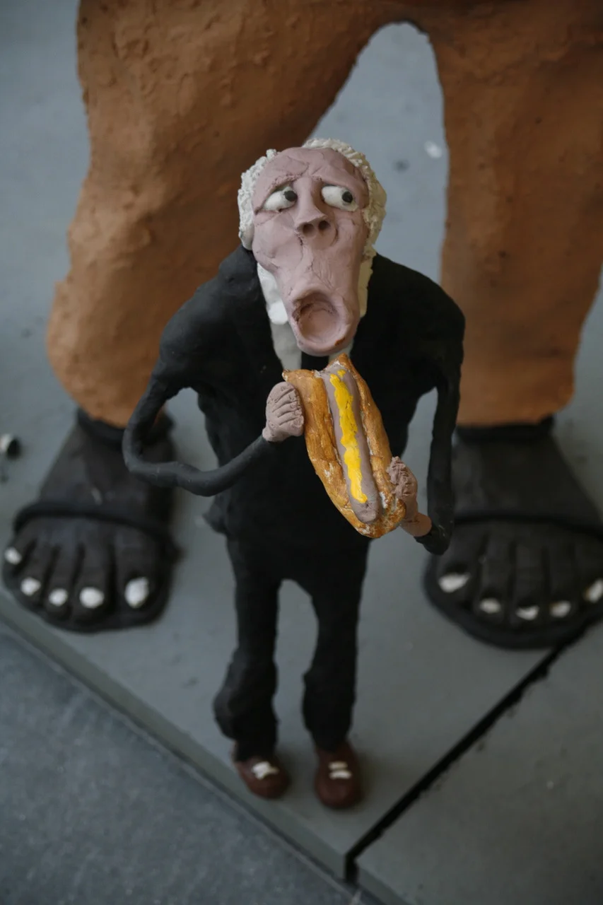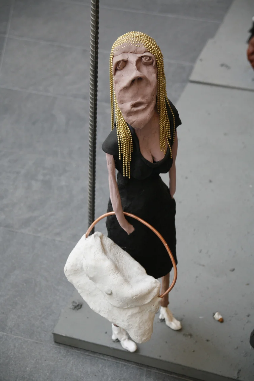 papier-mâché, epoxy resin, wire mesh, acrylic, wood, cloth